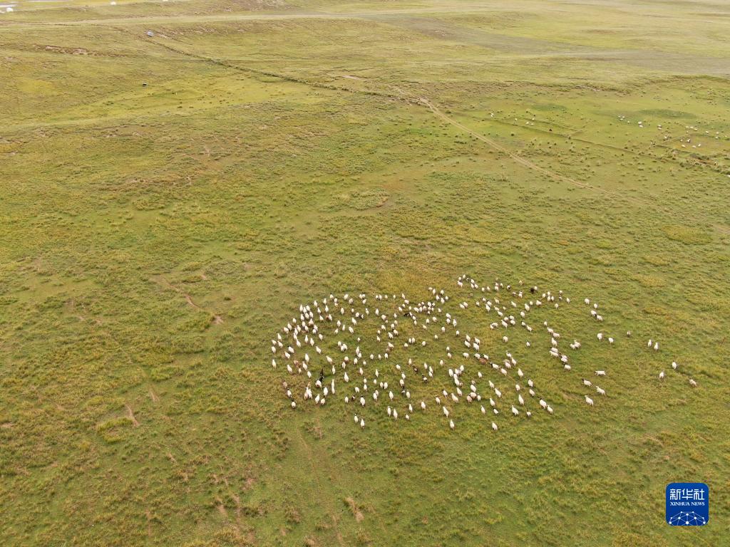 9月15日,一群羊在青海湖岸邊的牧場上覓食(無人機照片)。新華社記者 張龍 攝