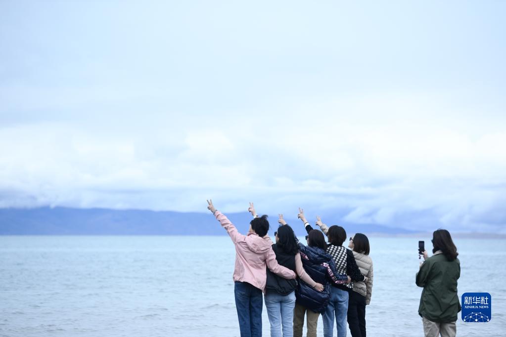 9月15日,游客在青海湖景區(qū)拍照留念。新華社記者 張龍 攝