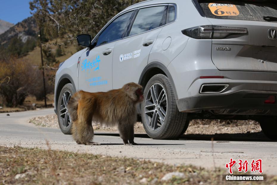 圖為一只藏獼猴近距離接觸2021瀾湄萬里行活動(dòng)用車。張希紅 攝