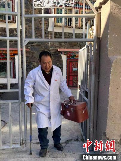 索木滾拄著拐杖出診。 壤塘縣委宣傳部供圖