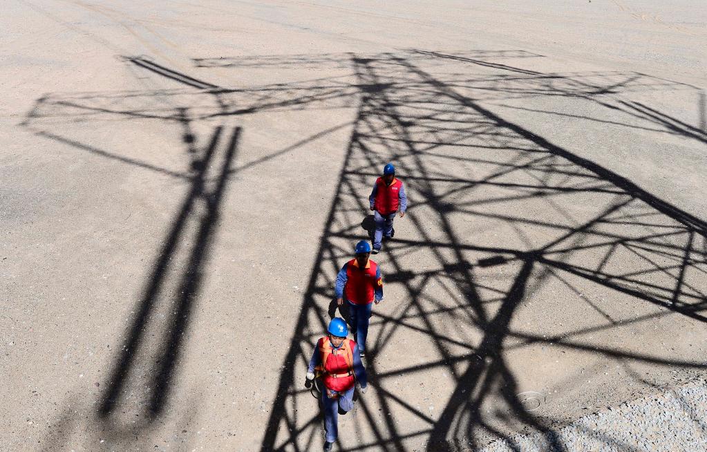 在青海格爾木,國(guó)網(wǎng)青海電力檢修公司工人徒步前往青藏聯(lián)網(wǎng)工程的輸電鐵塔。新華社記者張宏祥 攝