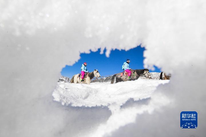 1月1日,登山者的馬隊(duì)在崗什卡雪峰的雪原上行進(jìn)。新華社記者 張龍 攝