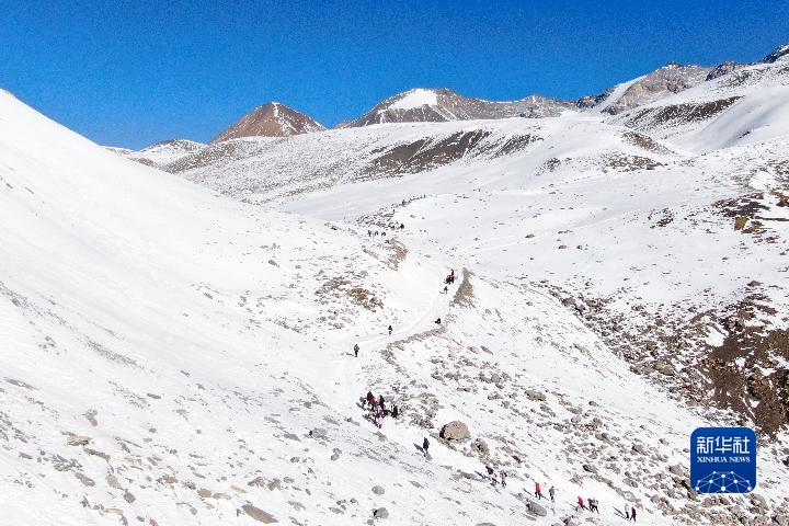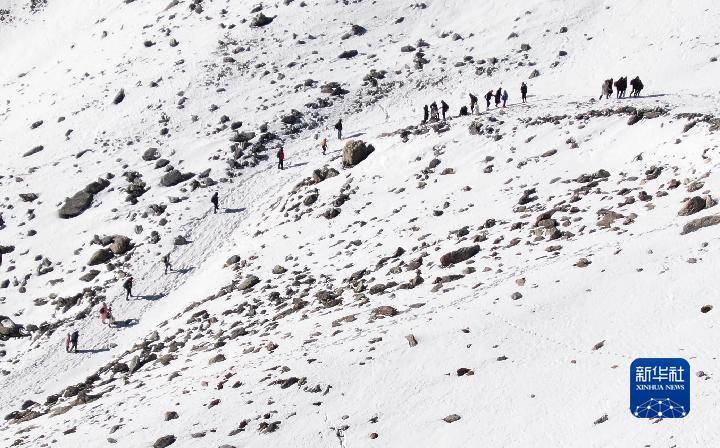 1月1日,登山愛(ài)好者攀登崗什卡雪峰(無(wú)人機(jī)照片)。新華社記者 張龍 攝