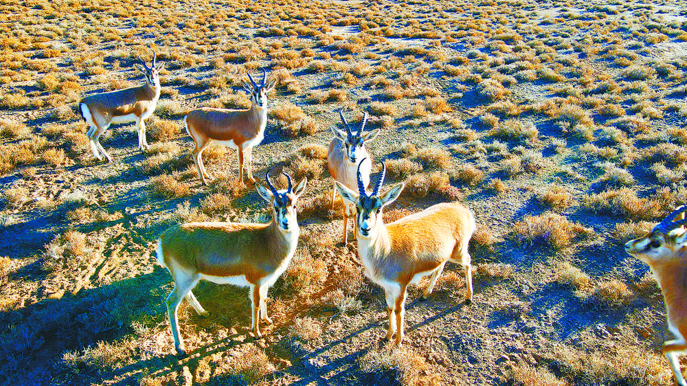 近日,海西蒙古族藏族自治州當?shù)財z影愛好者在祁連山國家公園德令哈片區(qū)拍攝到結伴覓食的珍稀野生動物——鵝喉羚。鵝喉羚屬典型的荒漠、半荒漠區(qū)域生存的動物,體型似黃羊,因雄性在發(fā)情期喉部肥大,狀如鵝喉,故得名“鵝喉羚”。