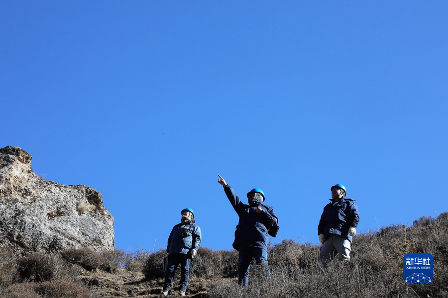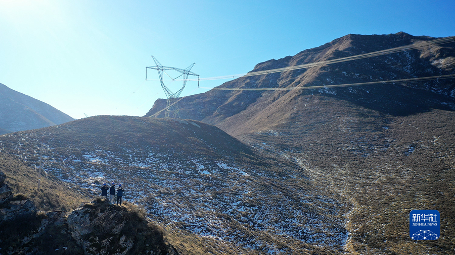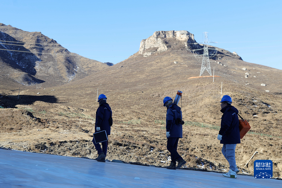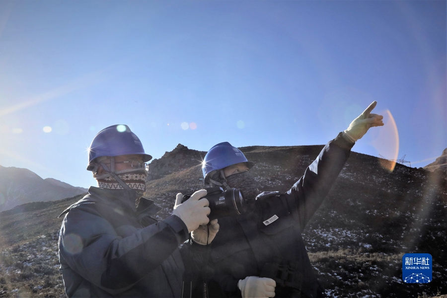 1月19日,國(guó)家電網(wǎng)青海省電力公司檢修公司輸電檢修中心專(zhuān)業(yè)班組成員在巡線途中查看線路運(yùn)行情況。新華社記者 趙玉和 攝