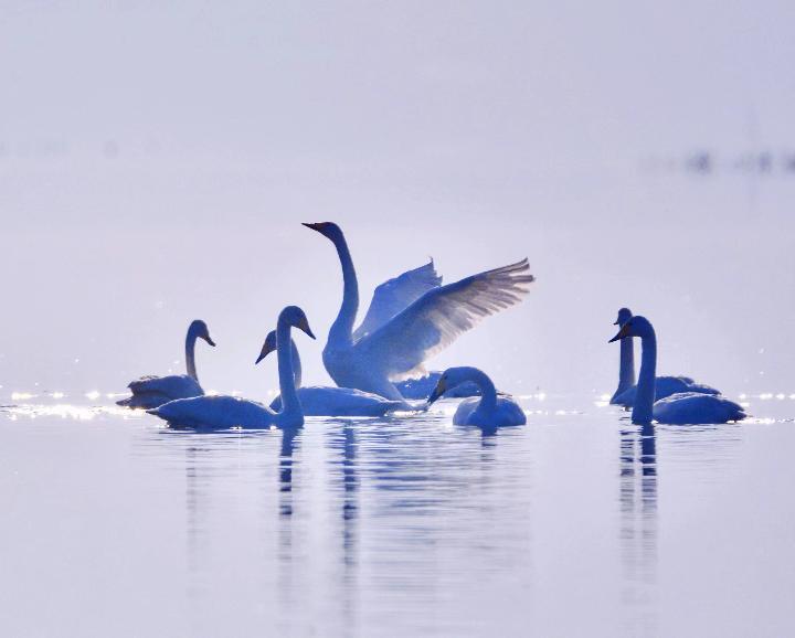 這是2021年11月23日在青海省海東市化隆回族自治縣境內(nèi)的黃河濕地拍攝的大天鵝。李玉峰供圖