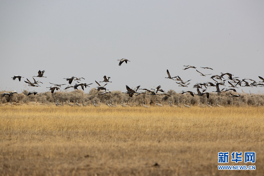 攝影愛(ài)好者在都蘭縣巴隆鄉(xiāng)境內(nèi)拍攝到的灰鶴。新華網(wǎng) 松太加 攝