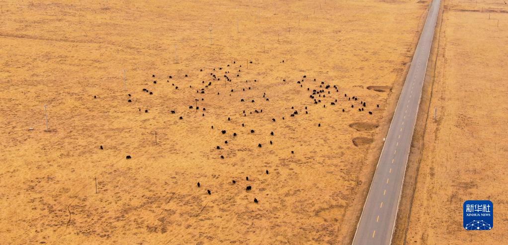 3月31日,在青海省黃南藏族自治州河南蒙古族自治縣,一群牦牛在草原上吃草(無人機照片)。新華社記者 王艷 攝