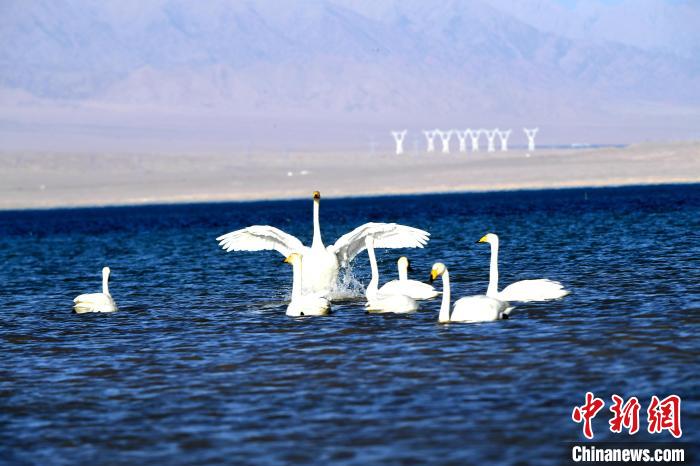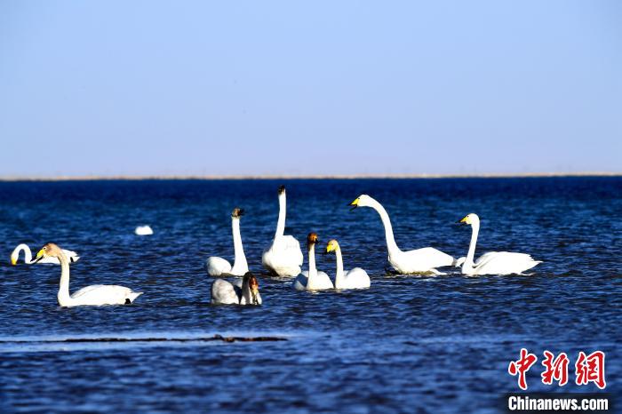 圖為天鵝群在湖中游蕩。青海多美生態(tài)環(huán)??萍加邢薰?供圖