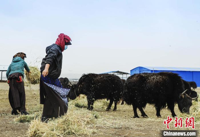 在畜棚外的柵欄里,母牛慵懶地反芻并守護(hù)著蹄下初生的牛犢,絲毫不因人員走動(dòng)而感到驚慌。從牧民變身飼養(yǎng)員的婦女們進(jìn)進(jìn)出出,忙碌著為欄里的牦牛添加飼料。