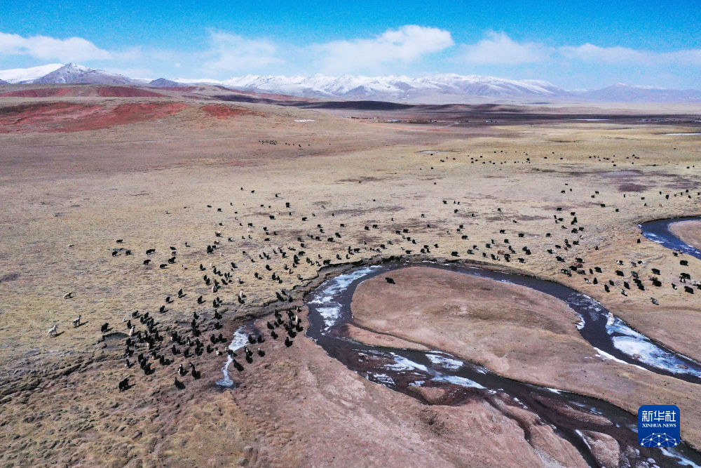 4月20日,在青海省玉樹藏族自治州曲麻萊縣,牦牛在草原上覓食(無人機照片)。新華社記者 柳澤興 攝