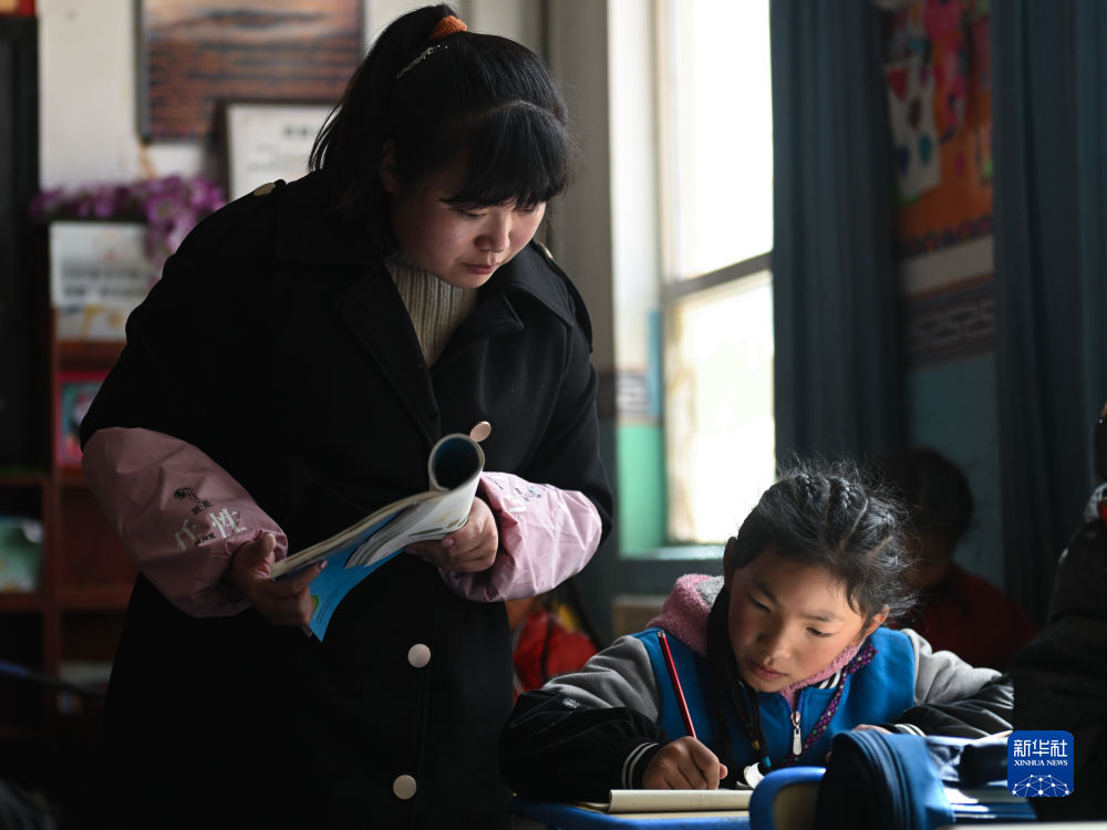 4月22日,青海省玉樹藏族自治州曲麻萊縣巴干鄉(xiāng)寄宿制小學(xué)的教師王芳(左)在指導(dǎo)學(xué)生學(xué)習(xí)。新華社記者 張龍 攝