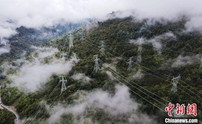海拔2700多米二郎山上,云霧穿梭在甘蜀改NA1041號至NA1043號鐵塔間。潘柱東 攝