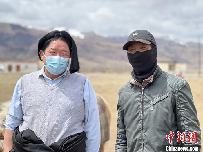 4月27日,才哇(左)在青海玉樹巴塘草原上與好友聊天。 中新社記者 李江寧 攝