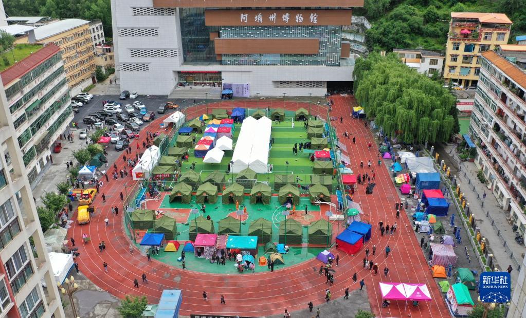 6月10日拍攝的馬爾康市州醫(yī)院背后廣場安置點(無人機照片)。新華社記者 劉坤 攝