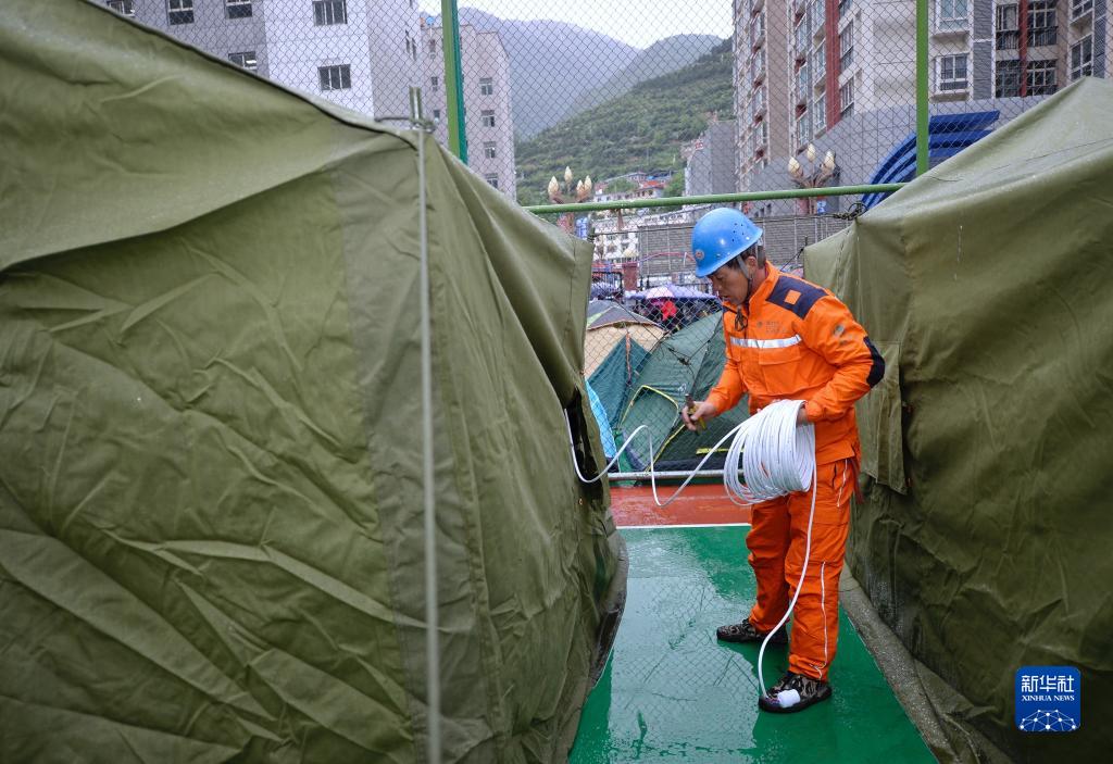 6月10日,在馬爾康市州醫(yī)院背后廣場安置點內,武警阿壩支隊隊員在搭建帳篷。新華社記者 劉坤 攝