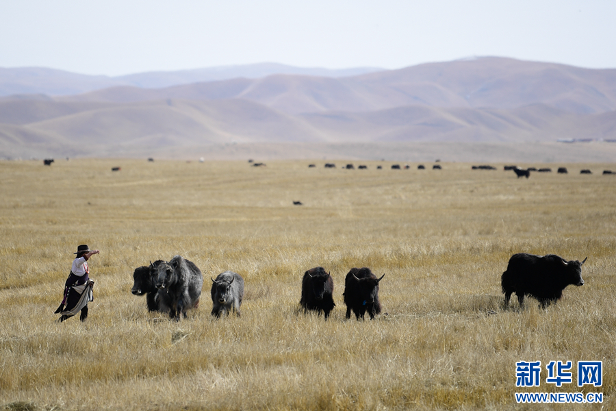 秋日時節(jié),在黃南州澤庫縣寧秀鄉(xiāng),當?shù)啬撩裨诓菰戏拍?。新華社記者 張龍 攝