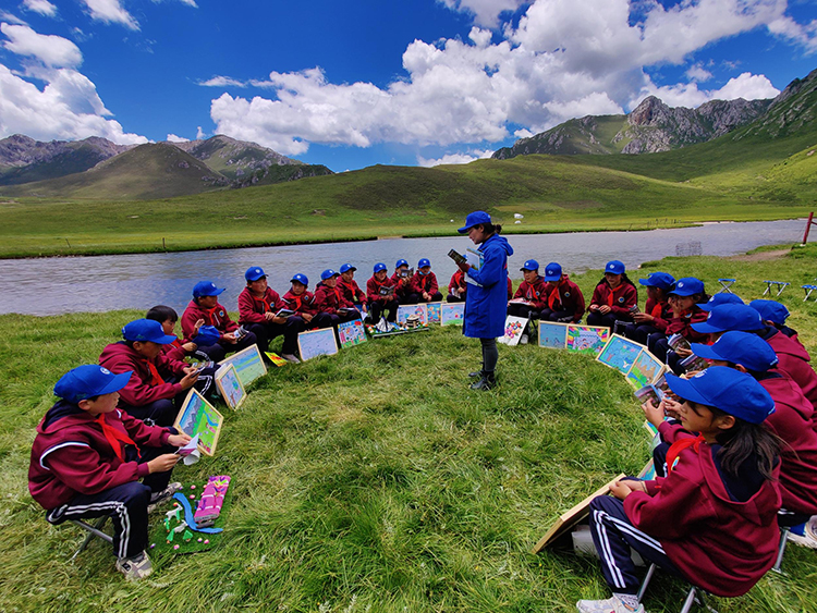 青海洮河源濕地公園管理服務(wù)中心的科普宣教員多杰康卓正在向完全小學(xué)的學(xué)生普及《濕地保護(hù)法》,讓大家身處濕地公園內(nèi),更加立體地知道什么是濕地以及保護(hù)濕地的意義。
