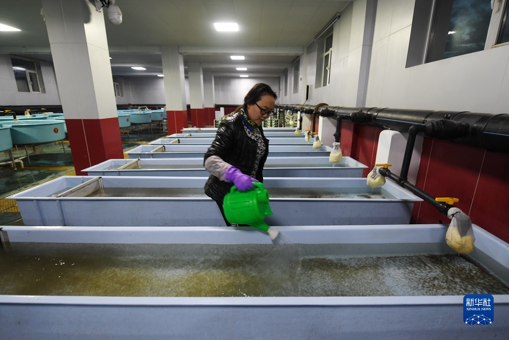 6月29日,在青海湖裸鯉沙柳河泉吉河增殖實(shí)驗(yàn)站,工作人員給條形培育槽中的湟魚(yú)苗灑喂調(diào)配的營(yíng)養(yǎng)液。新華社記者 范培珅 攝