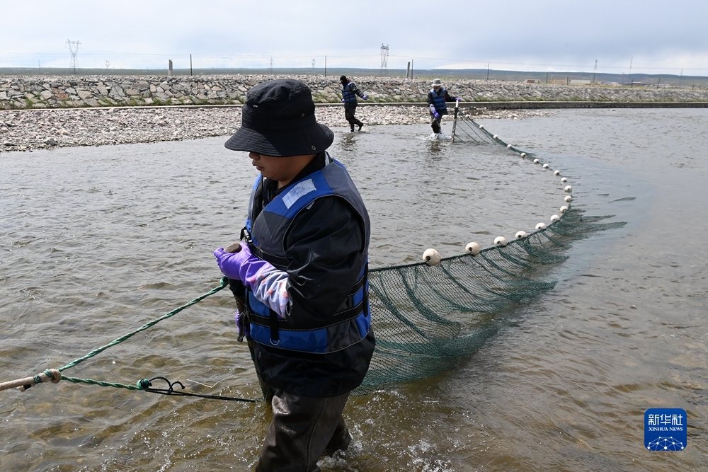6月29日,工作人員在剛察縣境內(nèi)的泉吉河中采捕親魚(yú)。新華社記者 范培珅 攝