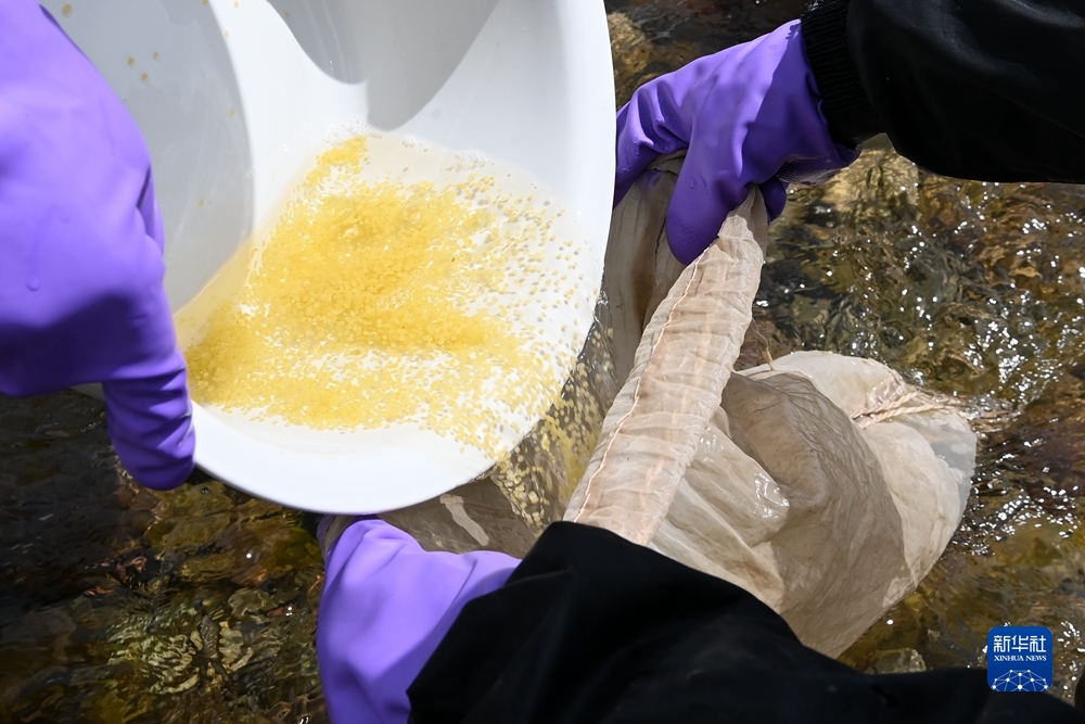 6月29日,工作人員在剛察縣境內(nèi)的泉吉河將湟魚(yú)受精卵裝入收集網(wǎng)袋。新華社記者 范培珅 攝
