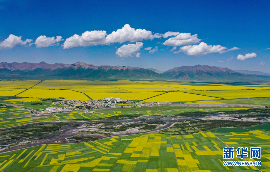 金黃色的油菜花在藍(lán)天白云映襯下,形成了一幅壯麗畫卷。新華網(wǎng) 宋忠勇 攝