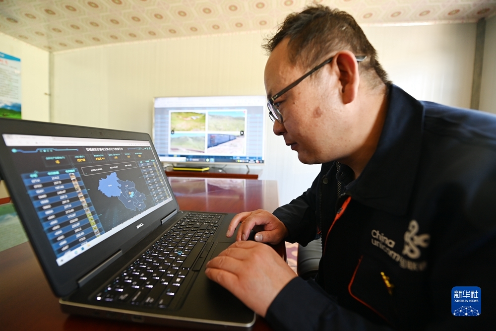 7月22日,在甘德縣生態(tài)畜牧業(yè)聯(lián)合社牦牛養(yǎng)殖基地,技術(shù)人員查看大數(shù)據(jù)平臺牦牛信息。新華社記者 范培珅 攝