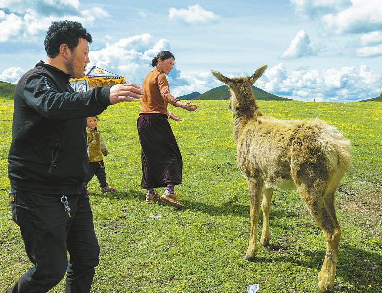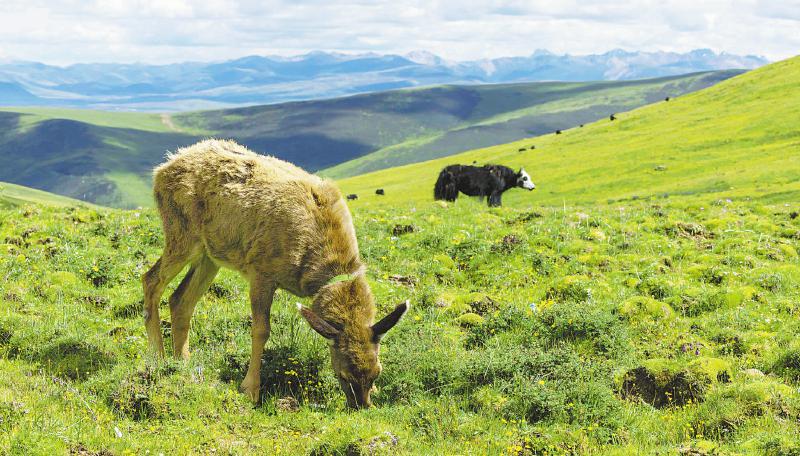 小白唇鹿每天都會跟著達瓦拉姆家的牦牛群在高原牧場吃草玩耍。尹鋼 攝