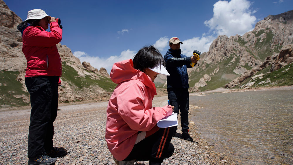 7月27日,來自青海省水文水資源測報中心的江源科考隊員在測量河流流速和記錄數(shù)據(jù)。新華社 陳杰 攝