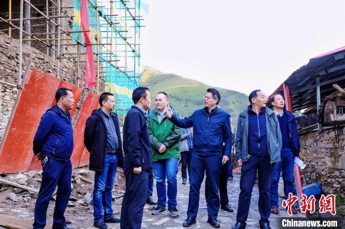 圖為馮志勇(中)在建設(shè)項(xiàng)目工地調(diào)研。(資料圖) 上海市援青干部聯(lián)絡(luò)組 供圖