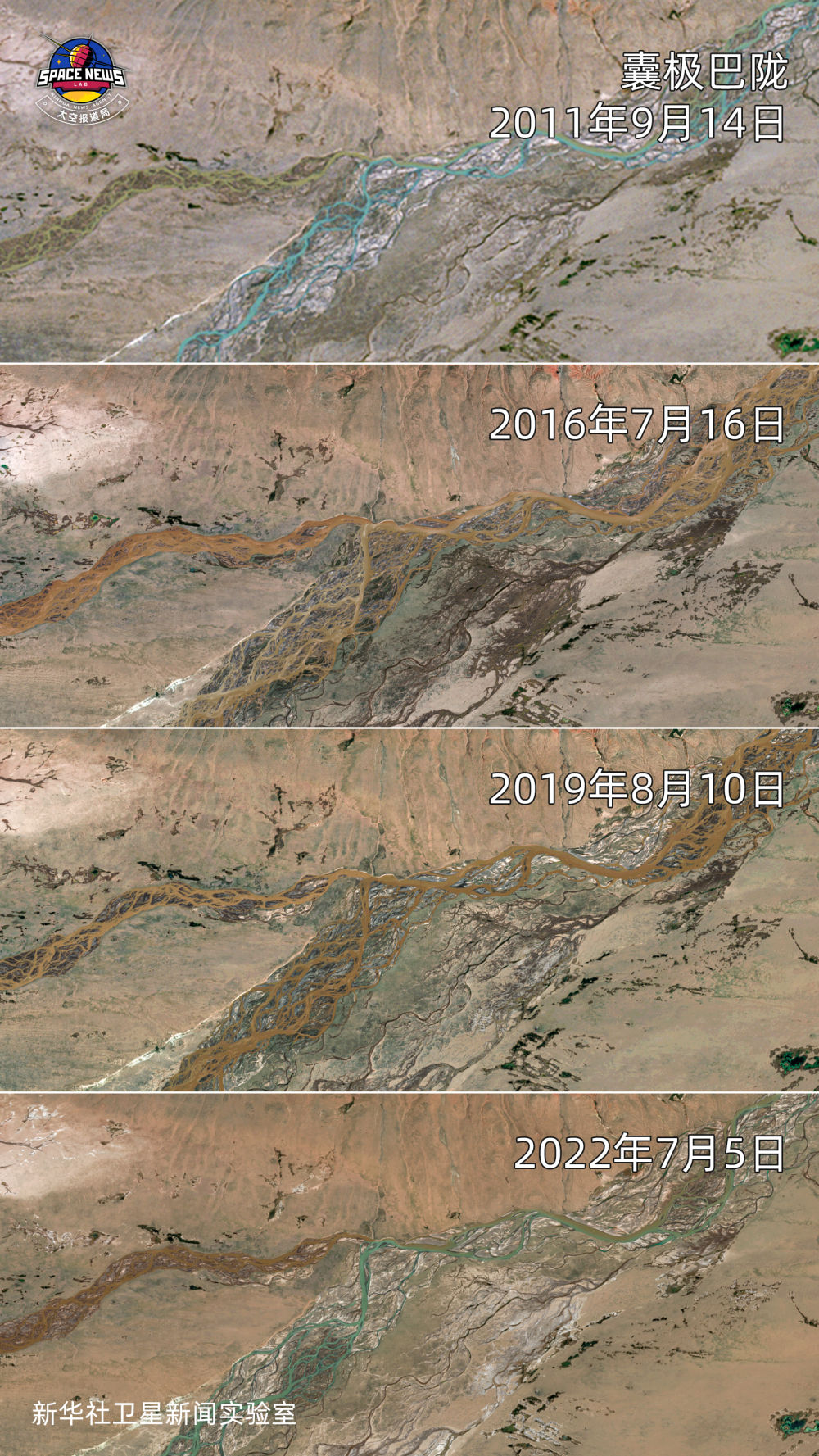 在長江正源沱沱河和南源當(dāng)曲匯合的囊極巴隴,不同時期的衛(wèi)星圖像清晰顯示,江源水系河道沖淤頻繁,水流不斷分汊又匯集,鳥瞰就像在大地上扎起許多小辮子。