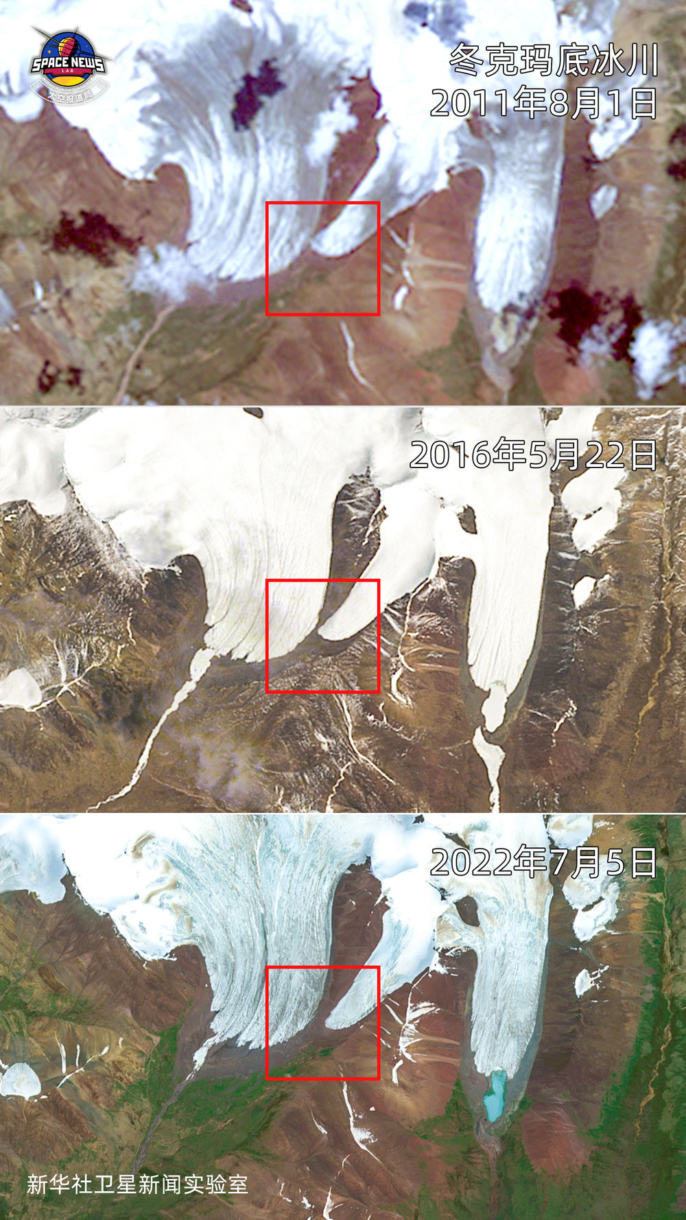 從冬克瑪?shù)妆ú煌攴菪l(wèi)星遙感圖像可以看出,在2011年冬克瑪?shù)妆ㄟ€是一個整體,此后就陸續(xù)分為大、小冬克瑪?shù)變蓷l冰川。紅框區(qū)域內(nèi)變化,說明兩條冰川末端之間距離逐漸拉大,處于消融退縮。