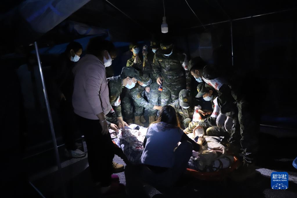 9月5日,武警四川總隊(duì)醫(yī)院醫(yī)療隊(duì)在甘孜州瀘定縣磨西鎮(zhèn)貢嘎山王廣場(chǎng)救治傷員。新華社 李華時(shí) 攝