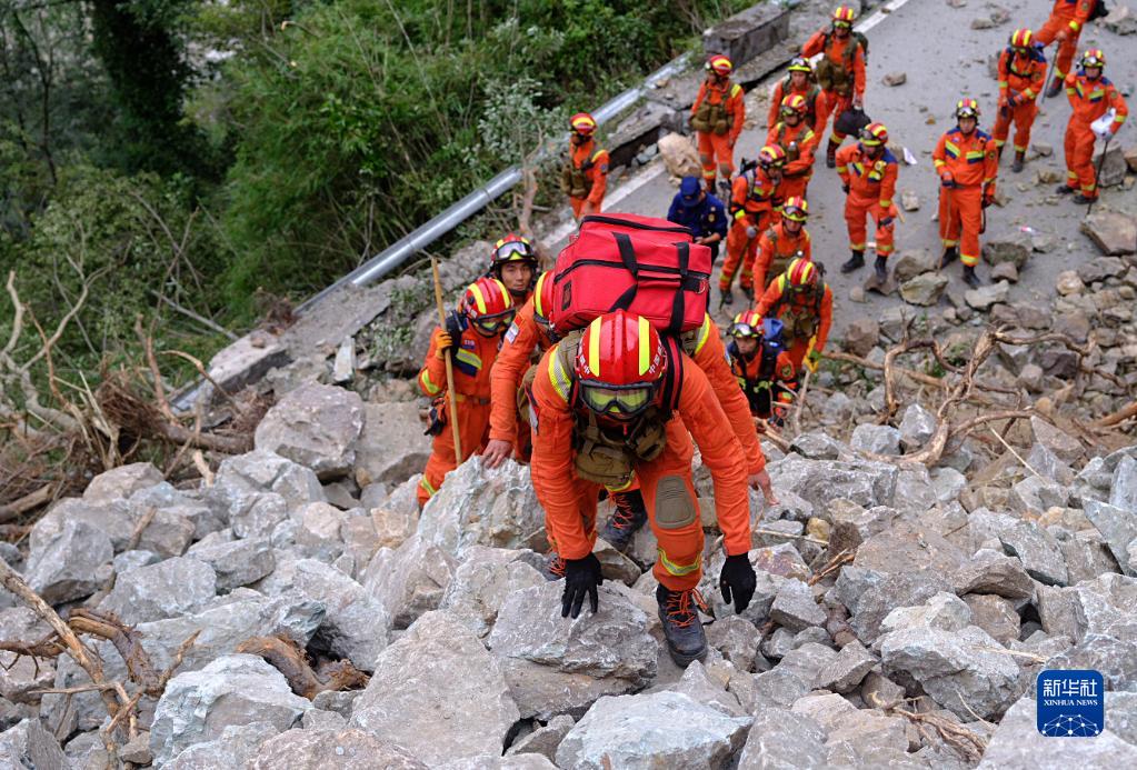 9月6日,在瀘定縣磨西鎮(zhèn)共和村,救援人員徒步進入災區(qū)救援。新華社 程雪力 攝