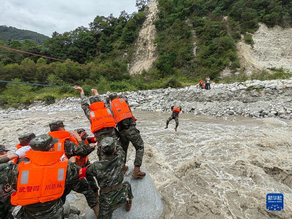 9月6日,武警四川總隊甘孜支隊救援官兵在瀘定縣磨西鎮(zhèn)通過繩索前往河對岸,救助被困群眾。新華社發(fā)(張文軒 攝)