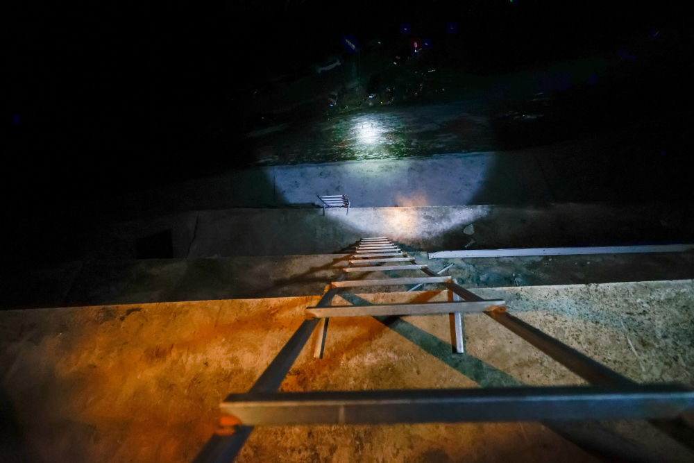 本以為沿著這條公路就可以走到得妥,轉(zhuǎn)過(guò)幾道彎,前面道路中斷完全無(wú)法通行,李祥帶我們到了真正可以下山的地方。這是一片分為好幾層的幾乎垂直的水泥邊坡,即便是應(yīng)急電筒的強(qiáng)光,也照不亮它的底。每層邊坡之間有鋼梯連接,我們要順著鋼梯爬下去,“山下會(huì)有車來(lái)接我們”,李祥淡定地說(shuō)。