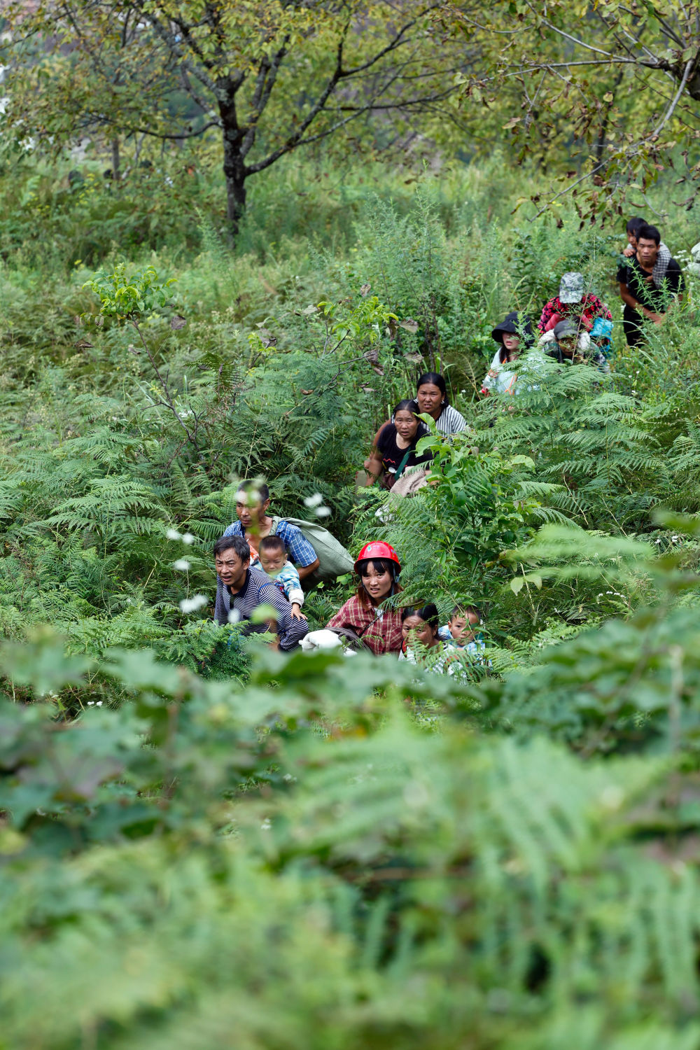 熟悉地形的村民在前帶路。其實(shí)毫無(wú)“路”可言,我和救援人員只能沿著依稀可辨的足跡向上攀爬。山高陡峻,時(shí)不時(shí)會(huì)遇到山體傾斜角度大于60度的路段,只能手腳并用才能上去。為了減輕負(fù)重,我把巧克力這樣的補(bǔ)給都放在了山下,只帶了一瓶水在身上。很快,滿頭大汗,汗水流入眼睛刺得生疼。抬頭望著遙遠(yuǎn)的需要翻越的山頭,對(duì)體力和耐性都是巨大考驗(yàn)。一些救援人員因?yàn)楣ぷ餍枰?,還背著很重的繩子,辛苦程度可見(jiàn)一斑。
