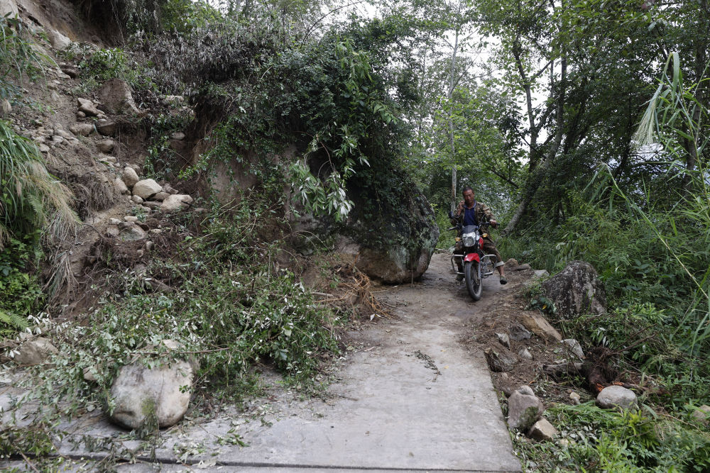 9月8日,青崗坪村村民騎著摩托車通過(guò)被滾落的山石阻擋的上山路。