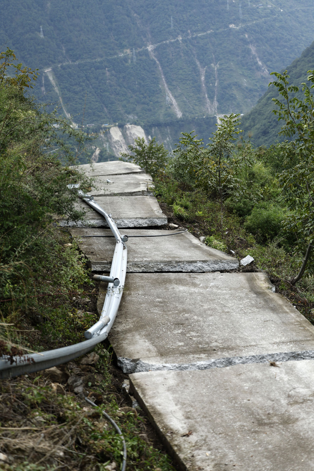 得知我們要去共和村,村干部叫來(lái)三輛摩托車,給車加了點(diǎn)汽油,送我們上去。上山的路本是只能容一輛汽車通過(guò)的水泥硬化路,經(jīng)過(guò)地震,沿途路面或裂開(kāi)、或傾斜、或拱起、或塌陷,滑落的巨石和被撕扯下來(lái)的樹(shù)木把小路擋得只容摩托車通過(guò),另一側(cè)就是深深的山溝。