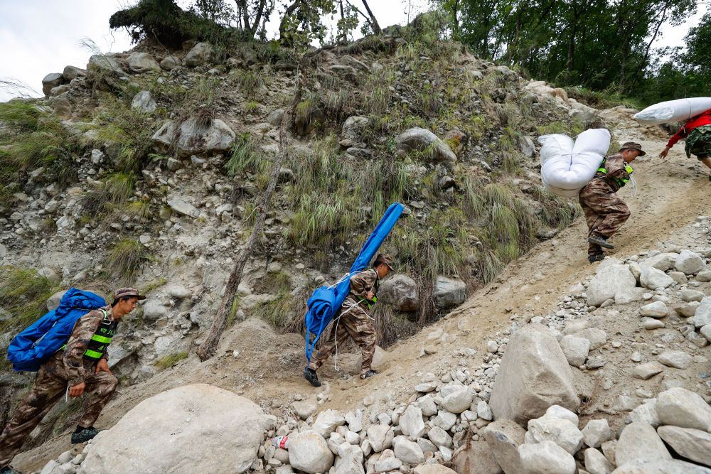 9月8日,在磨西鎮(zhèn)附近,救援人員沿著被地震損壞的小路向共和村運(yùn)送救災(zāi)帳篷。