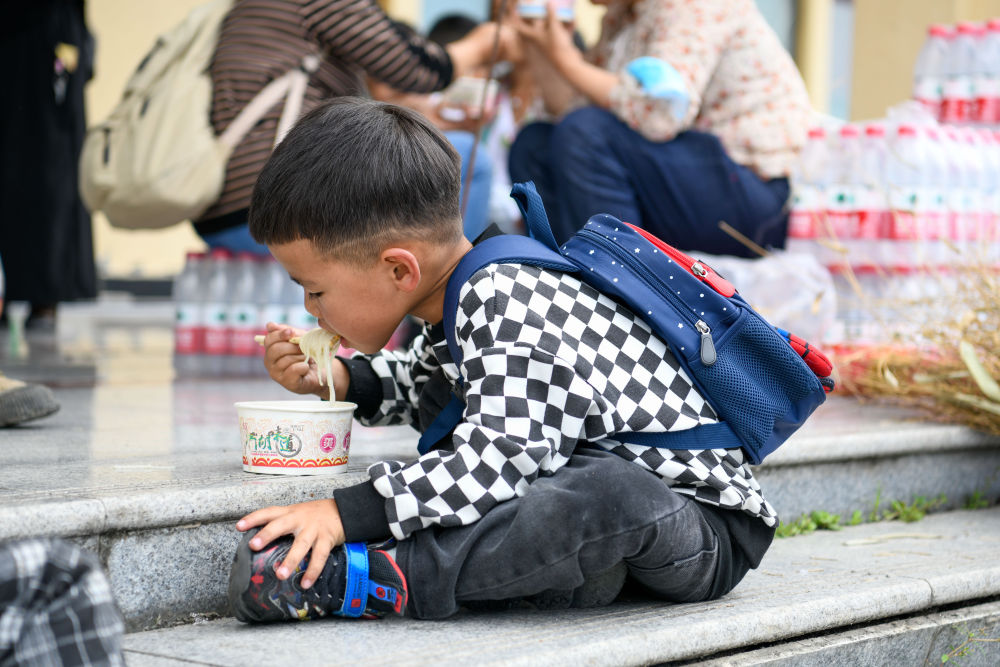 采訪當(dāng)天,這個(gè)安置點(diǎn)里的伙食團(tuán)依舊承包了在場(chǎng)所有村民、救援人員以及采訪隊(duì)伍的午飯,大家依次排隊(duì)領(lǐng)取,補(bǔ)充體力。一旁的草科鄉(xiāng)中心小學(xué)內(nèi),118名孩子也享用著熱氣騰騰的午飯。