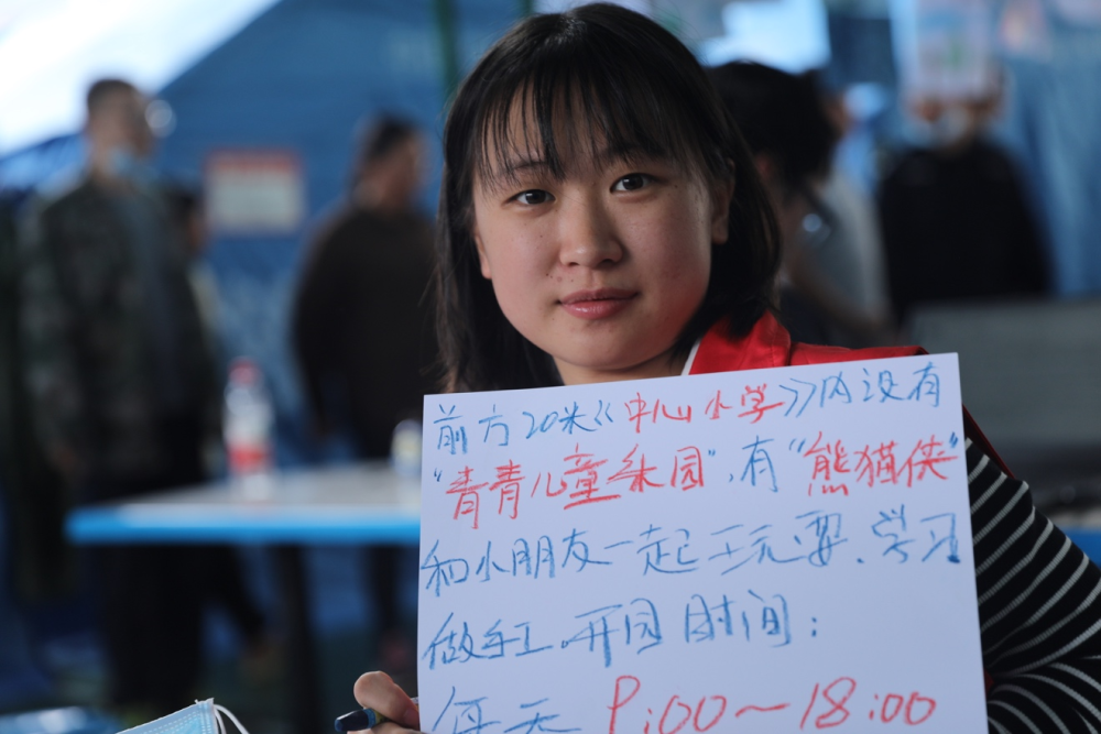 看到我手里的照相機(jī),他們十分好奇。一位叫駱雅萱的小朋友拉了拉我的衣角說(shuō):“姐姐,我想用你的相機(jī)給‘熊貓俠’拍一張照片好嗎?”“熊貓俠”是這里的一名志愿者,地震發(fā)生以來(lái)一直在安置點(diǎn)陪伴著小朋友們,大家都很喜歡她。我答應(yīng)了小朋友的請(qǐng)求,教她按下快門,看到自己拍的照片,她開(kāi)心地給“熊貓俠”展示。