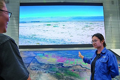 龍羊峽水光互補(bǔ)發(fā)電站的講解員楊若怡向來賓介紹當(dāng)?shù)厣鷳B(tài)逐漸向好的過程。