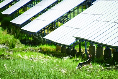 一只野兔在光伏板之間跳躍而過。生態(tài)改善后,園區(qū)吸引了許多野生動(dòng)物棲息。