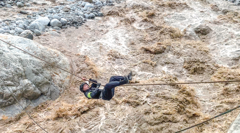 焦慮之際,另一組隊(duì)員沿河搜尋發(fā)現(xiàn)一塊離河對(duì)岸較近的巨石,率先過河的戰(zhàn)友打錨點(diǎn)接應(yīng),很快在兩邊架起一座“飛索橋”,曾經(jīng)當(dāng)過高山向?qū)У耐跞f銳第一個(gè)沖上去,四肢倒掛,背對(duì)激流,飛快移向?qū)Π丁>o接著,隊(duì)員沙馬澤呷躍上飛索。鋼索和飛索兩路同時(shí)過河,隊(duì)伍很快全部來到對(duì)岸。
