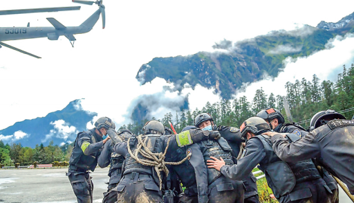 “9·5”地震發(fā)生前兩周,特警支隊(duì)舉行了一次警務(wù)技能大比武。比武科目包括高海拔山地武裝奔襲、簡(jiǎn)易擔(dān)架制作、傷員應(yīng)急處理、傷員轉(zhuǎn)運(yùn)、結(jié)繩……兩周后,他們來到另一個(gè)比武場(chǎng),這一次是與死神較量。
