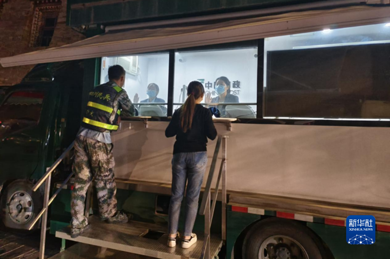 9月6日,“9·5”四川瀘定6.8級(jí)地震后的第二天,震中磨西鎮(zhèn)街頭的帳篷郵局和郵政金融服務(wù)車(chē)投入使用,兩處臨時(shí)郵局都亮起了暖心的燈光。