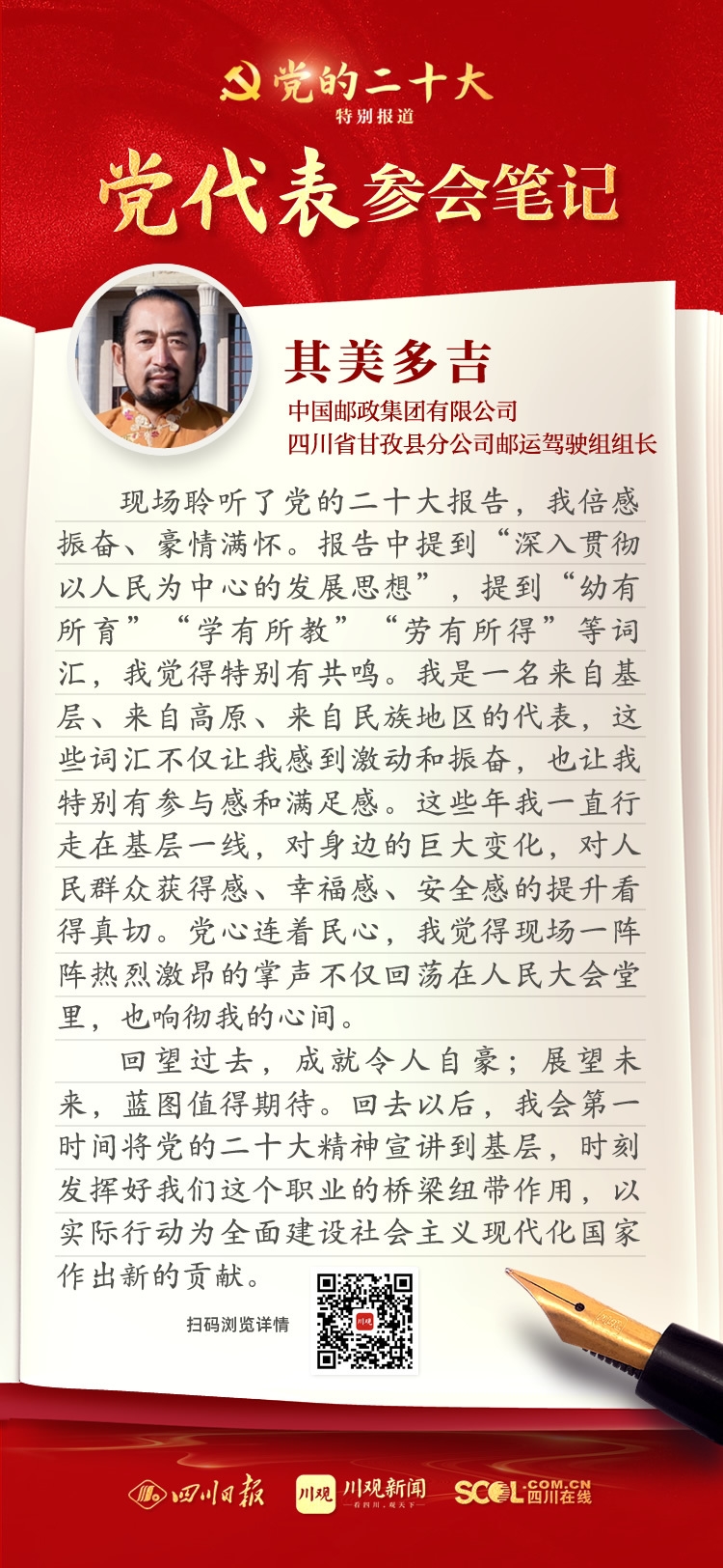 出席盛會,來自四川的黨代表深感使命光榮、責(zé)任重大,大家認真履職,結(jié)合報告談?wù)J識、談體會、談打算。川觀新聞特此推出“黨代表參會筆記”欄目,分享黨代表們的參會心得,敬請垂注。
