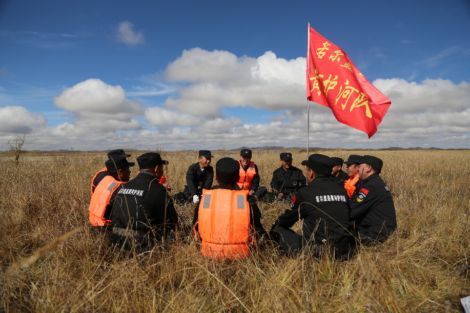在四川省阿壩州若爾蓋縣,部分黃河護河隊隊員列隊準備出發(fā)巡河。新華社記者 王曦 攝