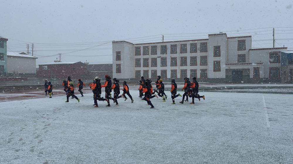 運球、顛球、體能訓練……回到家鄉(xiāng)后,一有時間,多果和小伙伴們堅持練球。惡劣的環(huán)境并未減少他們的信心和決心,練習時常有不少隊員因鏟球等動作滑倒在地,他們笑著拍拍身上的泥土和冰雪,繼續(xù)練習。